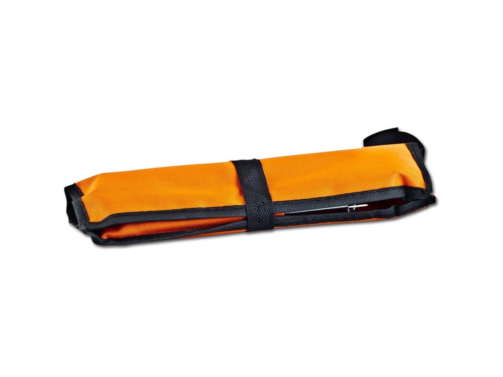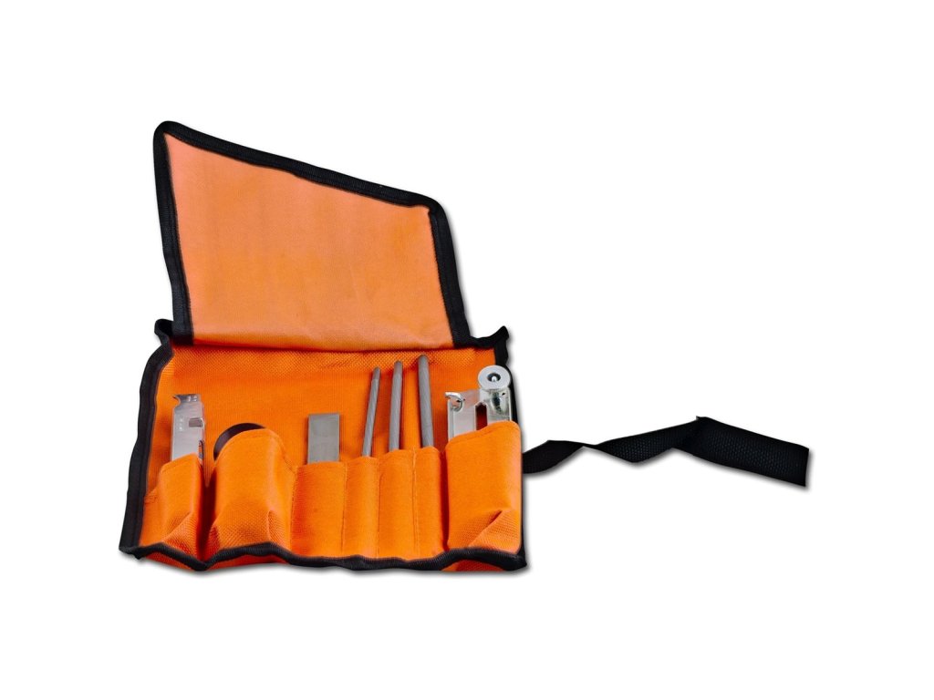 Univerzální sada pro broušení pilových řetězů a srážení omezovacích zubů Arnold v praktické rolovací brašně.