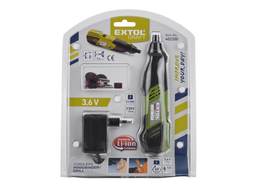 Aku minibruska je určena k jemnému broušení, odhrotování, frézování, gravírování, leštění a k jemnému vrtání otvorů. Nízká hmotnost, bateriový pohon, malé rozměry, ergonomicky tvarované tělo a gumové úchopové části umožňují příjemné držení a snadnou manipulaci při práci. Brusku je možné používat jak s připojením k napájecímu zdroji prostřednictvím nabíječky, tak s odpojením napájecího kabelu po nabití akumulátoru. Díky Li-ion akumulátoru je možné aku brusku kdykoliv dobíjet, aniž by se tím snižovala kapacita akumulátoru. Li-ion akumulátor ztrácí energii vlivem samovybíjení velmi pomalu a vydrží dlouho nabitý.- gumové úchopové části na stranách brusky tlumí vibrace a chrání před vysmeknutím brusky z ruky