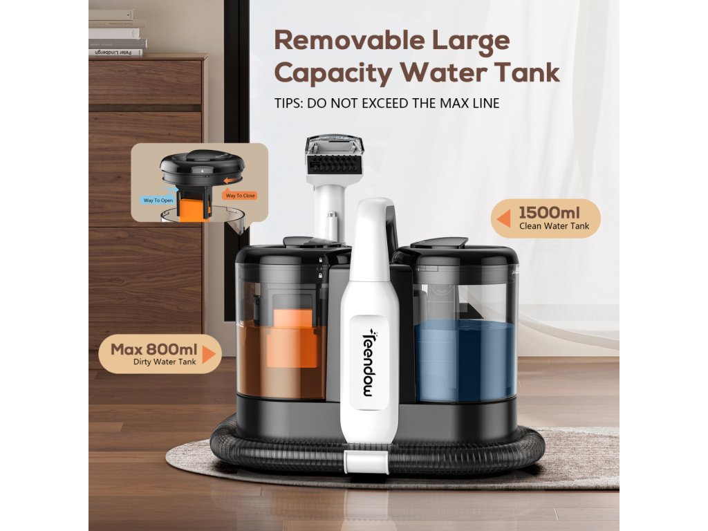Obsahuje jak velký, tak malý kartáč, takže si můžete vybrat správnou volbu pro různé typy povrchů, což z něj činí vysoce přizpůsobivé řešení. Je vybaven nádrží na čistou vodu o objemu 1500 ml a nádrží na špinavou vodu o objemu 800 ml, což umožňuje zvládnout velké úkoly čištění na jeden zátah a minimalizovat potřebu častých zastávek. Navržen pro tiché čištění, pracuje při méně než 80 dB, což je ideální pro domácí použití bez rušení rodiny nebo domácích mazlíčků.