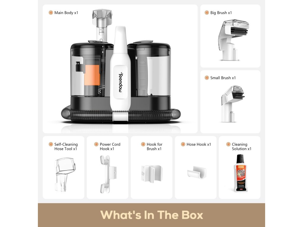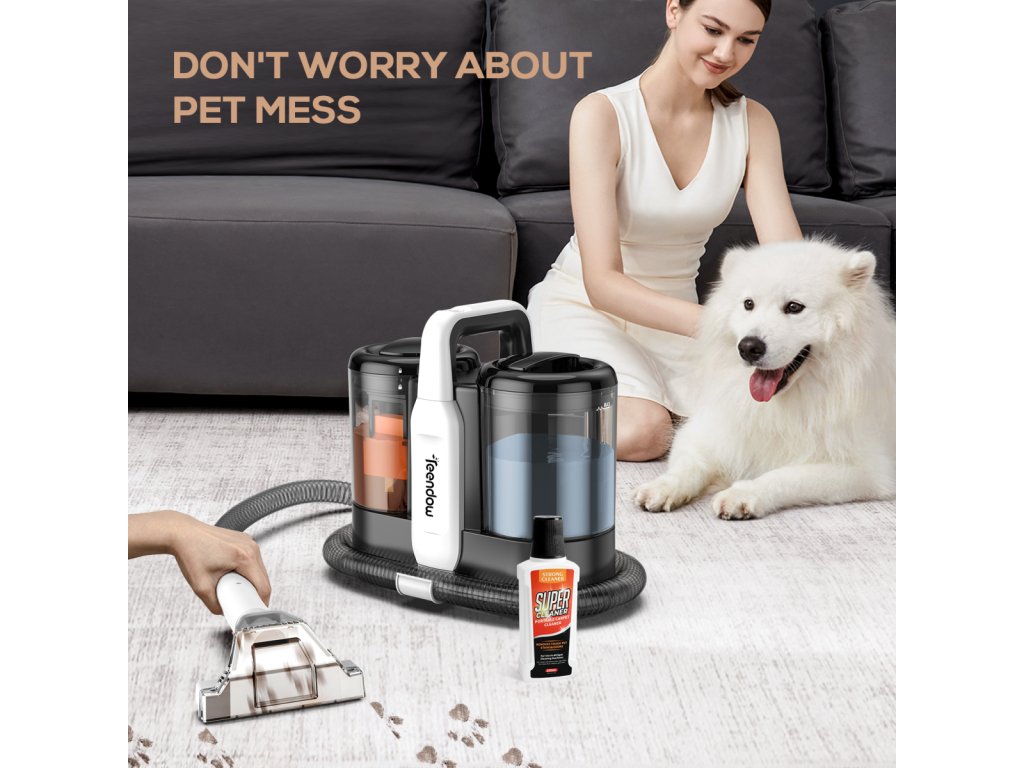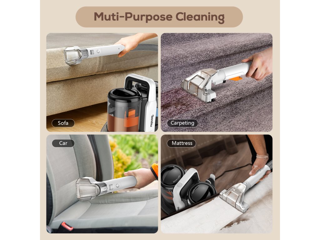 S Teendow C5 snadno zvládnete tepování koberců a čalounění, mokré vysávání, kartáčování a odstranění různých skvrn jedním tahem. Je ideální pro úklid po dětech, domácích mazlíčcích, nebo pro běžnou údržbu čistoty. Tento čistič pro bodové čištění skvrn je spolehlivým pomocníkem.