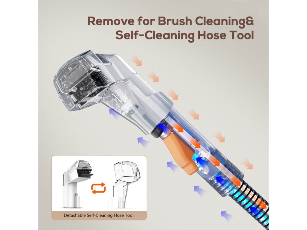 Napájecí kabel má délku 5 metrů a hadice 1,2 metru, což umožňuje snadné čištění všech oblastí. S hmotností 4 kila a designem horní rukojeti je snadno přenosný, což je skvělé pro čištění pohovky, koberců nebo auta. Nádrž na vodu, hlavice kartáčku a filtr s vodotěsností IPX4 jsou omyvatelné, což zajišťuje dlouhou životnost a pohodlí při údržbě. Materiál ABS poskytuje zvýšenou odolnost