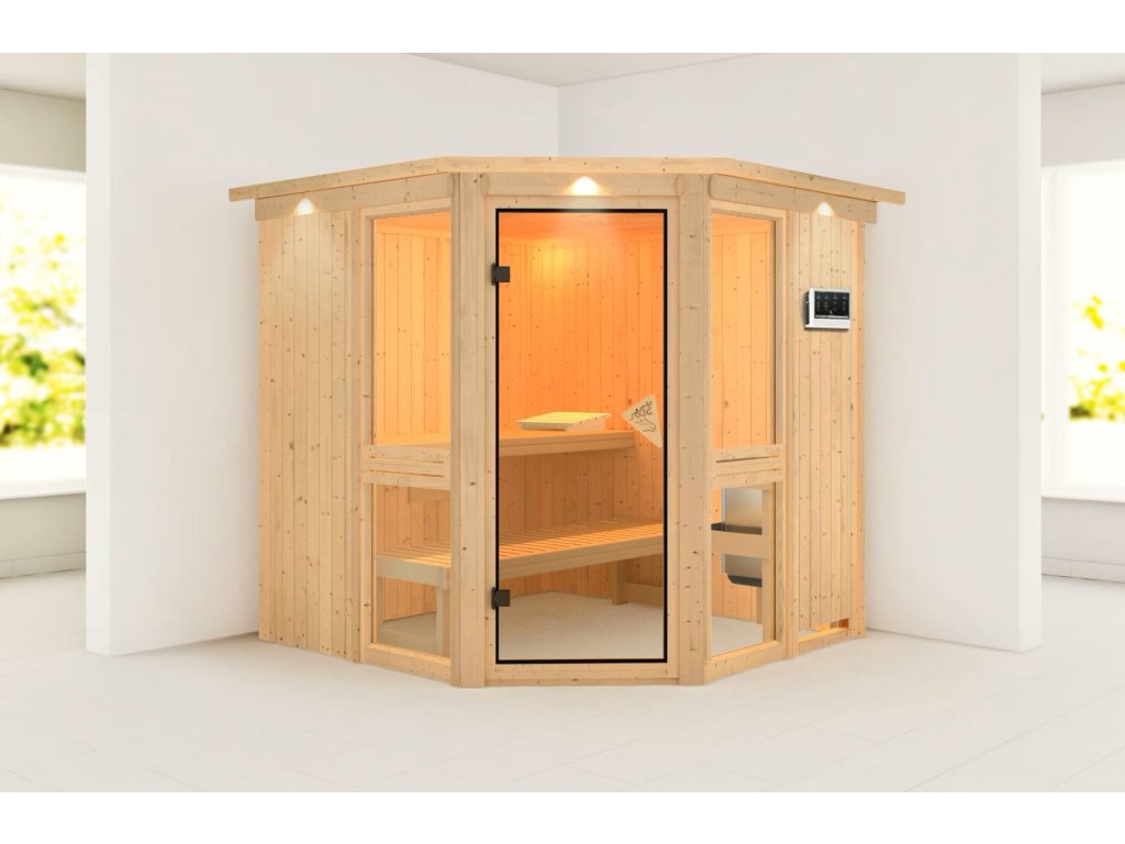 Finská sauna určená pro dvě ležící osoby. Má rozměr š 196 x h 196 x v 196 cm. Tento model finské sauny je určený do temperovaných interiérů domu nebo bytu. Stropní římsa včetně 3 LED světel šikovně dotváří atmosféru sauny. Její výrobce, firma KARIBU HOLZTECHNIK z německých Brém, dokázala svými výrobky úspěšně navázat na staletou tradici skandinávského saunování a současně do ní zapracovat dnešní moderní technologie. Sauna je celá vyrobena ze dřeva severského smrku v přírodním provedení. Dřevo pochází ze vzdáleného severu Evropy a je chemicky naprosto neošetřené (není ani namořeno ani nalakováno). V důsledku toho je prosté všech známých problematických látek, které by se v průběhu saunování mohly ze dřeva uvolňovat. Tato interiérová sauna vykazuje mimořádné tepelně-izolační vlastnosti. Stěny sauny jsou složeny z vnitřní a vnější vrstvy speciálně hlazených prken s perem a drážkou, mezi kterými je 42 mm silná tepelná izolace v podobě minerální vlny. Celková síla stěny je tak 68 mm. Zadní nebo boční nepohledové strany orientované ke stěně místnosti mají vnější stranu ze sololitu. Proto jsou při stejné tepelné izolaci o cca 10 mm tenčí než pohledové strany pokryté palubkami.