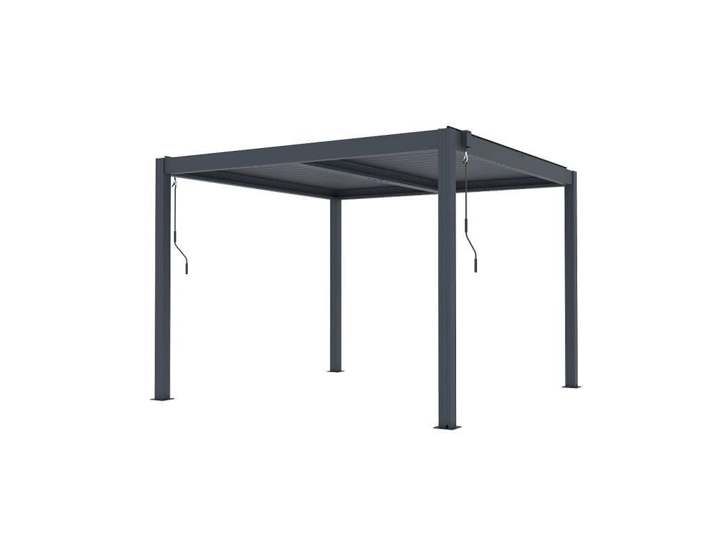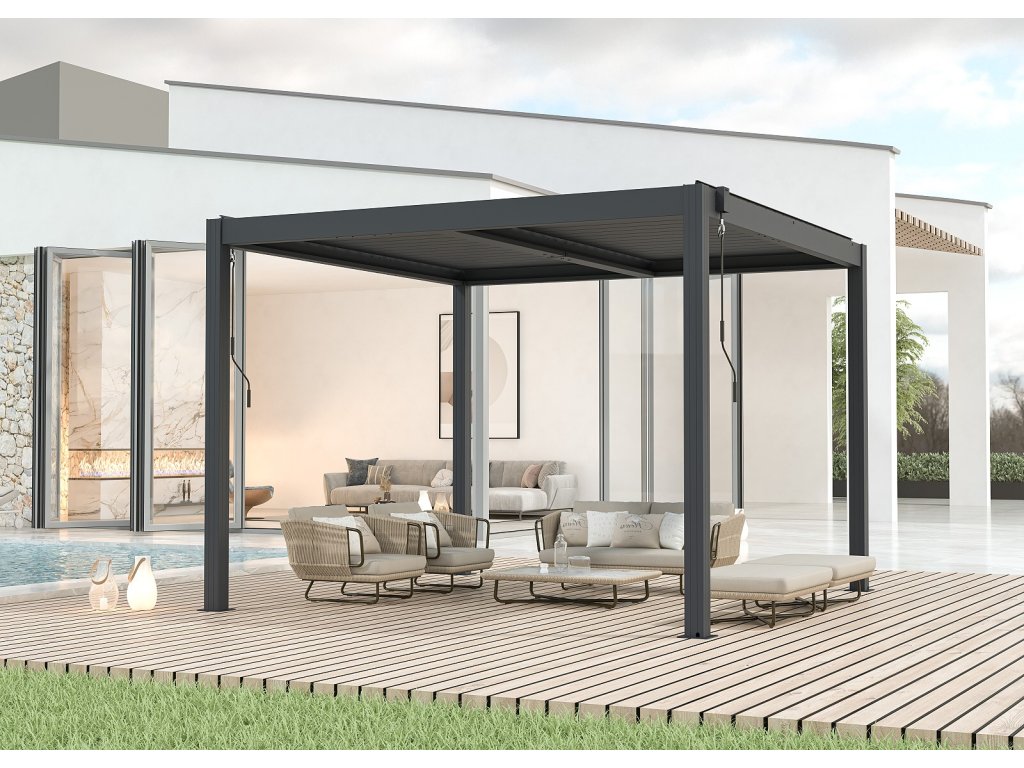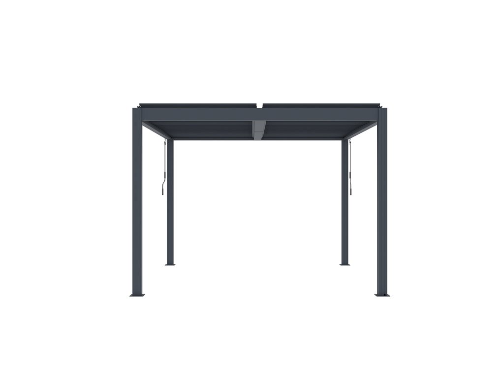 Volně stojící bioklimatická pergola LANITPLAST BASIC o rozměrech 3 x 3 metru je praktickým a elegantním řešením pro zastřešení venkovního posezení na Vaší zahradě. Robustní a stabilní konstrukce v moderním antracitovém odstínu RAL 7016 s matnou povrchovou úpravou se snadno začlení do jakéhokoliv prostředí a nevyžaduje kotvení do stěny. Sloupy i nosné profily jsou vyrobeny z hliníku a otočné lamely z kvalitní oceli, vše je opatřené vypalovaným práškovým lakem (komaxit). Střešní lamely z pozinkované oceli jsou rovněž opatřeny práškovou barvou, která zajišťuje vysokou odolnost vůči povětrnostním podmínkám. Celkem 38 otočných lamel poskytuje spolehlivou ochranu před slunečními paprsky i deštěm. Jejich sklon lze plynule nastavit od zcela uzavřené polohy (0°) až po plné otevření v úhlu 90°. Ovládání lamel je manuální a probíhá pomocí praktické kličky, která je konstruována tak, aby bylo možné ji naklonit a zabránit tak poškození povrchu pergoly při manipulaci. Její umístění navíc umožňuje bezproblémové používání dalších doplňků, jako jsou boční zástěny nebo moskytiéry, aniž by omezovala jejich funkčnost.