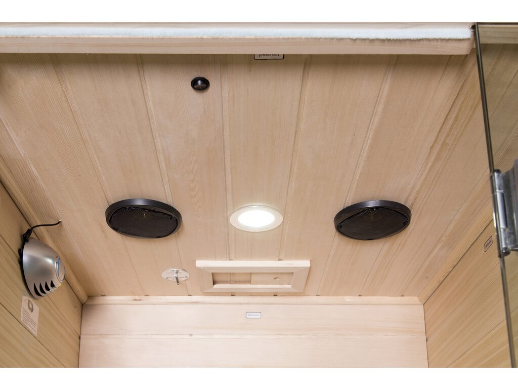 Skleněné dveře umožňují pohodlný výhled po okolí sauny. Součástí výbavy je ionizér a rádio/mp3 přehrávač.