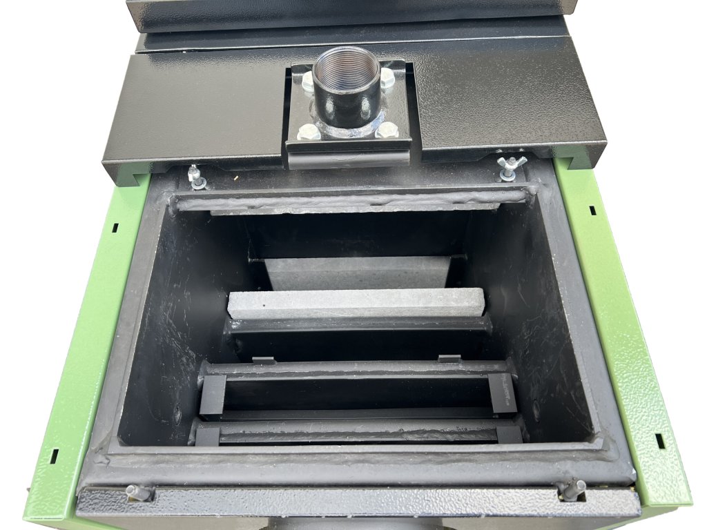 Regulace sekundárního vzduchu přiváděného do spalovací komory zvyšuje účinnost kotle. Primární vzduch je přiváděn pod rošt regulovatelnou klapkou v popelníkových dvířkách. Regulace se provádí ručně nebo automatickým regulátorem výkonu (TRV), který je dodáván jako příslušenství současně s kotlem. Vstup a výstup topné vody je standartně opatřen přírubami G2″, je možno si ale objednat i kotel s přírubami G 1 1/2″ nebo DN 65. Kouřovod je v ose kotle na zadní straně.