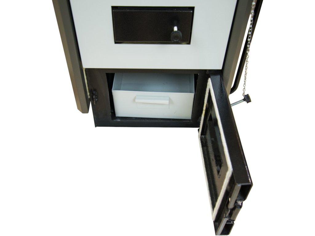 Regulace sekundárního vzduchu přiváděného do spalovací komory zvyšuje účinnost kotle. Primární vzduch je přiváděn pod rošt regulovatelnou klapkou v popelníkových dvířkách. Regulace se provádí ručně nebo automatickým regulátorem výkonu (TRV), který je dodáván jako příslušenství současně s kotlem. Vstup a výstup topné vody je standartně opatřen přírubami G2″, je možno si ale objednat i kotel s přírubami G 1 1/2″ nebo DN 65. Kouřovod je v ose kotle na zadní straně.