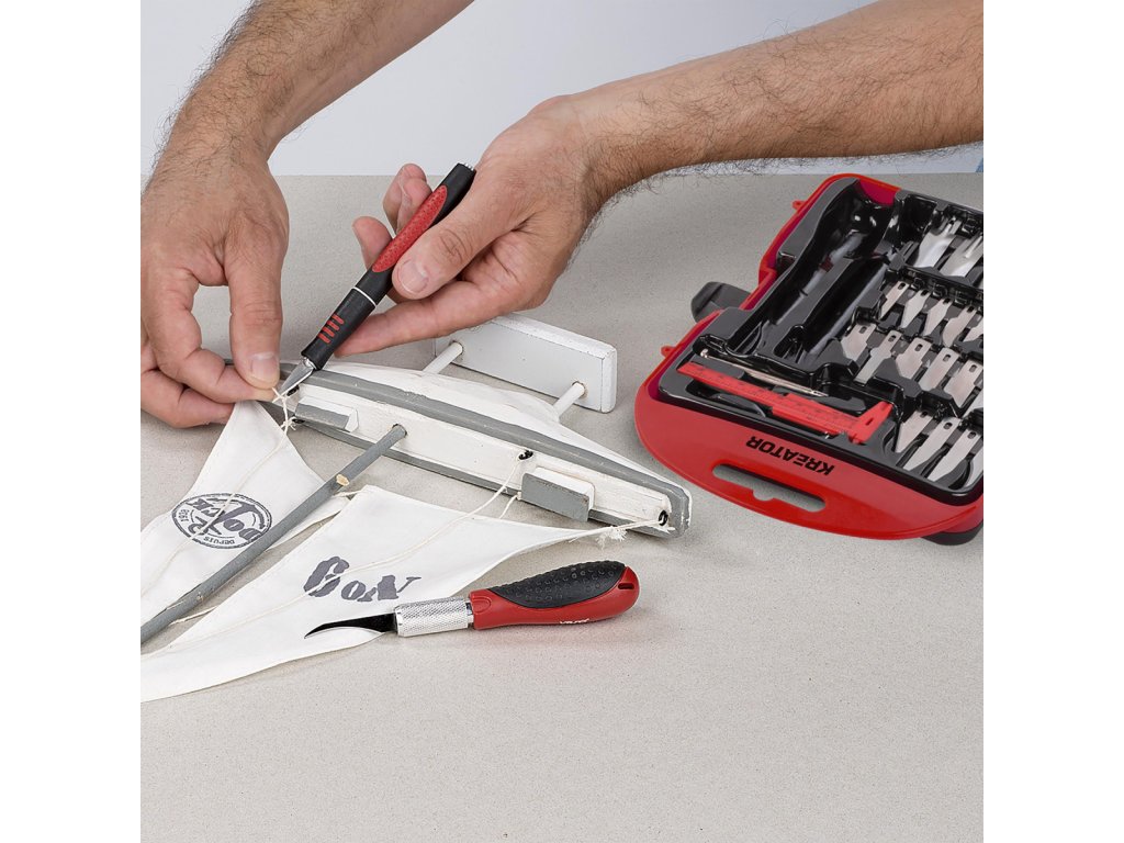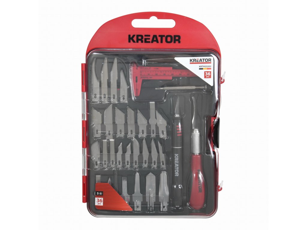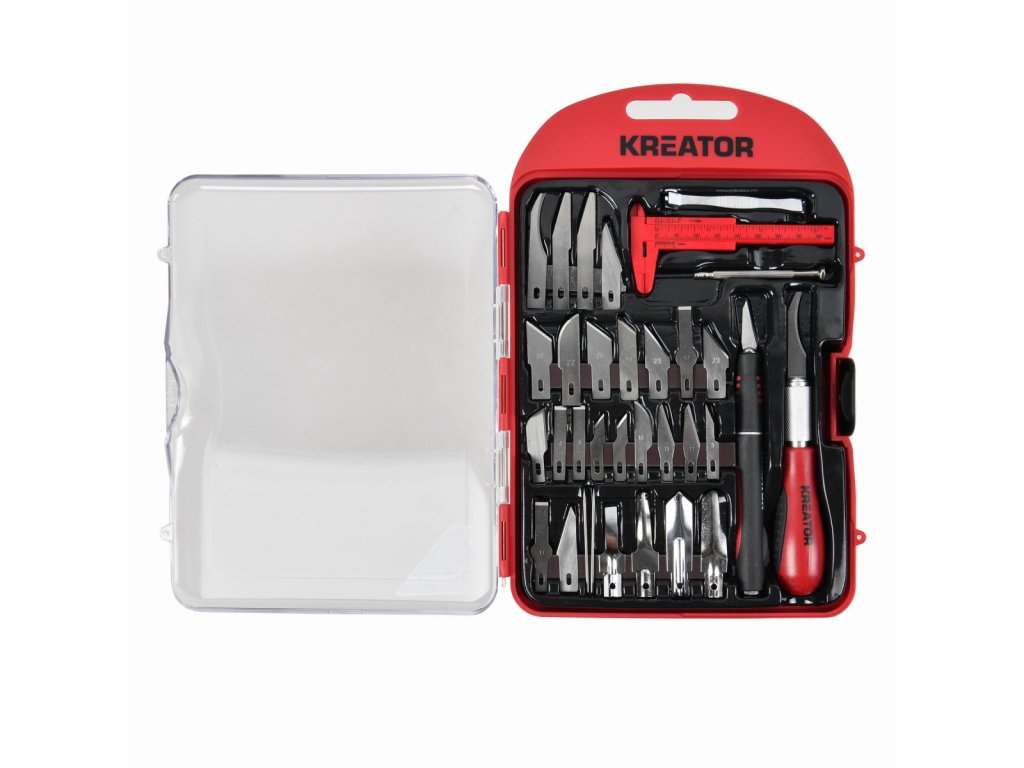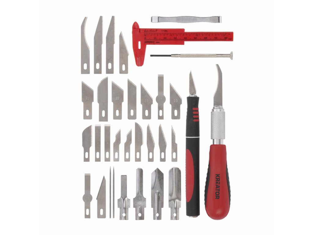Tato sada modelářských nožíků KRTH23202 z naší řady Kreator je ideální pro detailní práci. Kromě 30dílných čepelí obsahuje sada také 2 dlouhé rukojeti nožů s ergonomickou měkkou rukojetí a protiskluzovým povrchem, posuvné měřidlo, pinzetu a 1 přesný šroubovák. Tyto praktické modelářské nožíky mají několik využití, například pro modelářství nebo přesné řezání papíru a kartonu.Obsah balení: