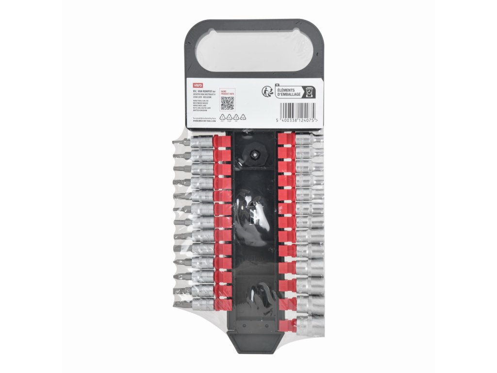 Tuto 28dílnou sadu nástrčných klíčů KRTH30108 z naší řady Kreator použijte k povolování nebo utahování matic a šroubů. Sada obsahuje různé velikosti, takže budete mít vždy po ruce ten správný nástrčný klíč. Nástrčné klíče mají upínací rozměr 1/4" a jsou vyrobeny z robustní chrom-vanadiového slitiny.Sada obsahuje:13x nástrčná hlavice 1/4:4 / 4.5 / 5 / 5.5 / 6 / 7 / 8 / 9 / 10 / 11 / 12 / 13 / 14mm13x nástrčný bit 1/4:Plochý: 5.5, 7.0Philips: PH1, PH2Torx: T10, T15, T20, T25, T30Hex: 3, 4, 5, 6 mmNástavec 100 mm72T ráčna 1/4Obsah balení: