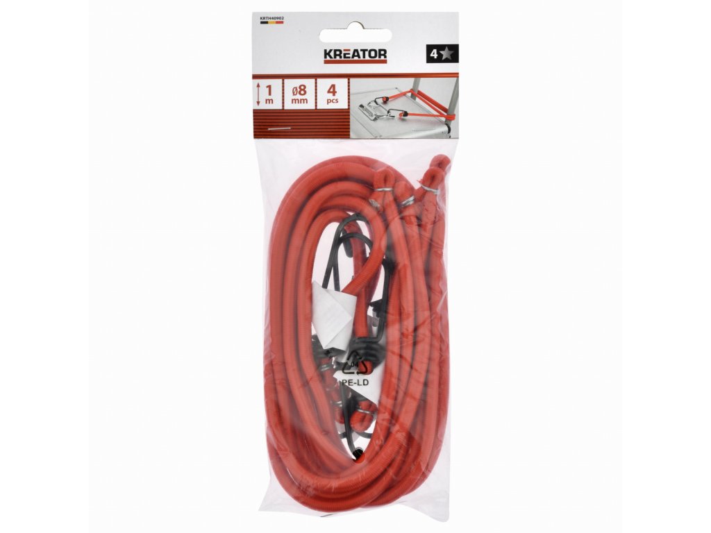 Pro upevnění předmětů na jízdní kolo, rudlík a další použijte tyto fixační popruhy s ocelovými háky KRTH40902 od Kreator. Gumové popruhy mají délku 1000 mm a průměr 8 mm. Balení obsahuje 4ks popruhů.