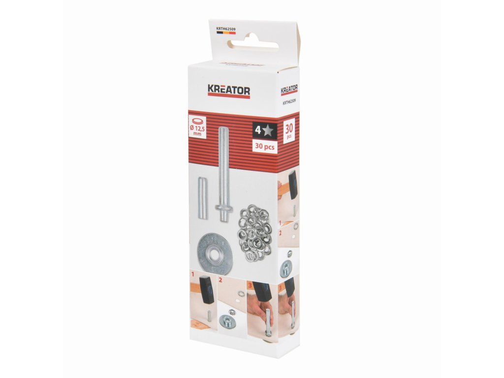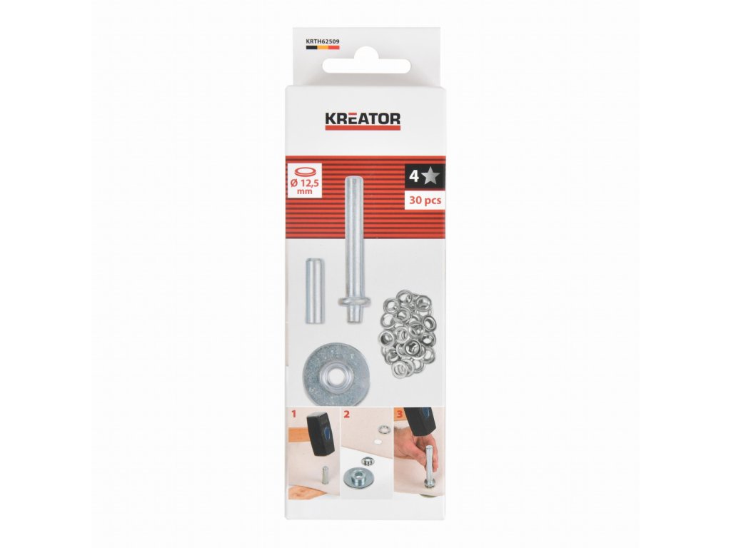 Tento ruční nástroj na nýtovací očka KRTH62509 od Kreator lze použít k připevnění oček s maximálním průměrem 12,5 mm k plachtám a jiným textiliím. Toto se provádí pomocí kladiva.Obsah balení: