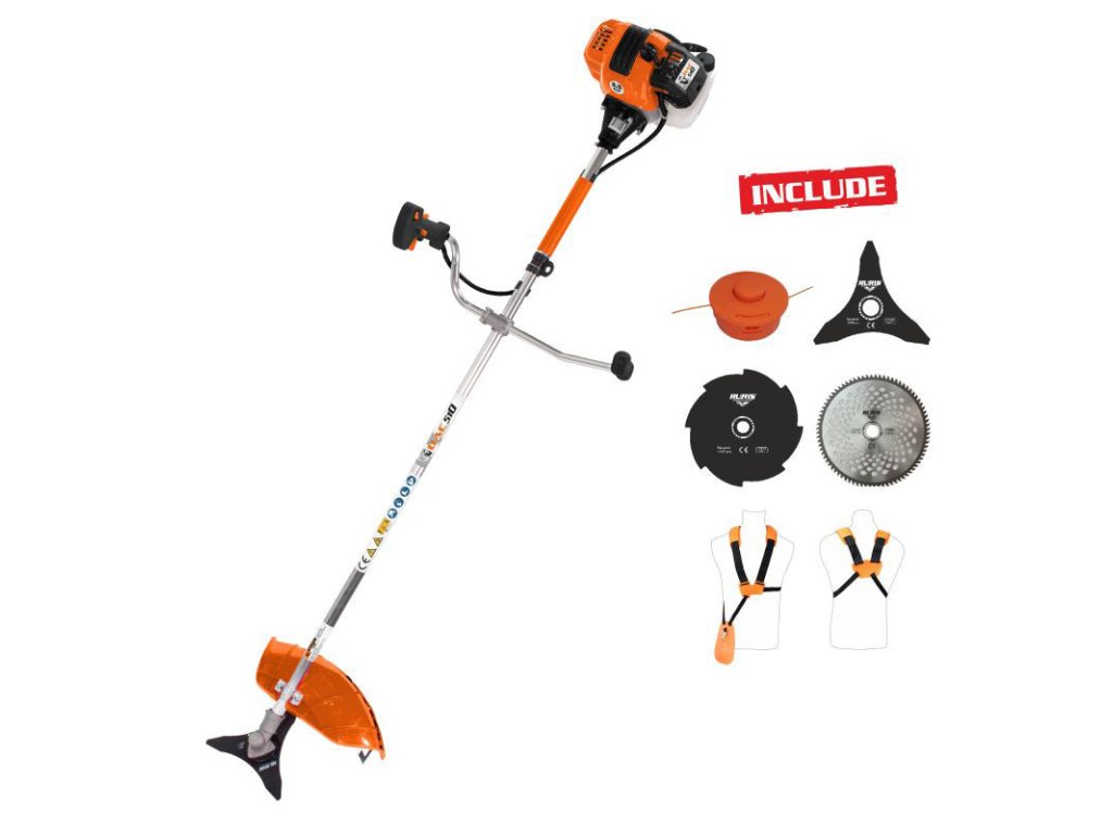 Příslušenství ve výbavě: | 3-zubý nůž, 8-zubý kotouč, 80-zubý vidiový kotouč, žací hlava, popruh, nádoba na míchání benzínu a oleje, sada nářadí |