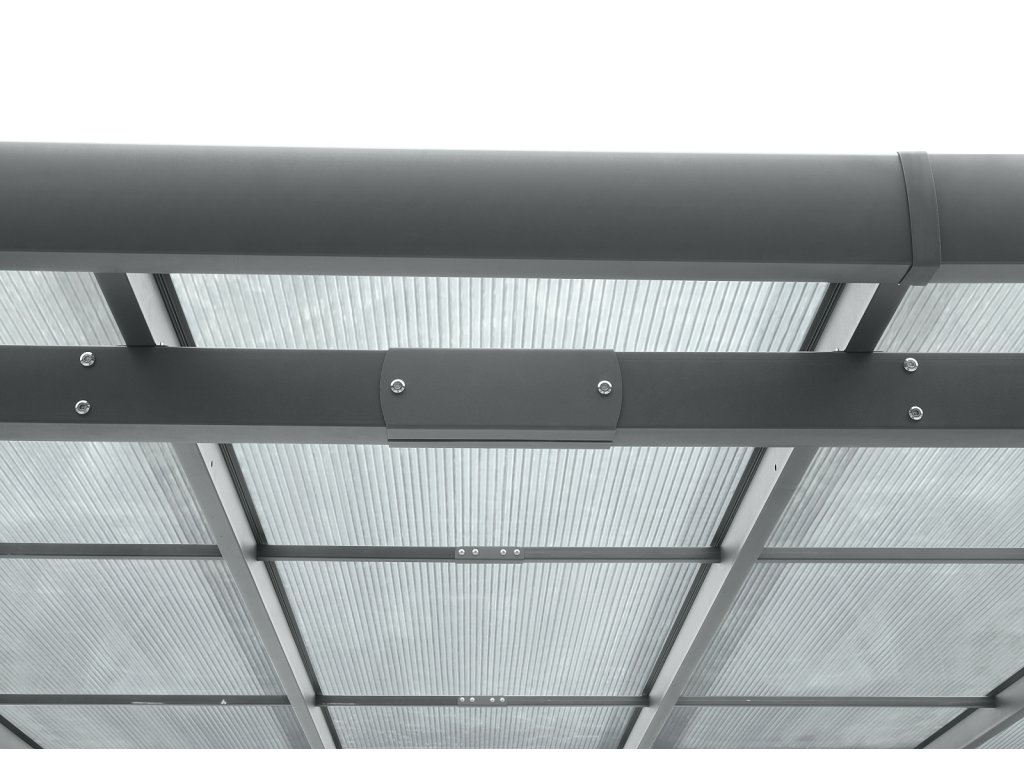 Zahradní ocelová pergola s polykarbonátovou střechou. Konstrukce pergoly je z ocelových pozinkovaných profilů nastříkaných kvalitní práškovou vypalovanou barvou (komaxit), proto dlouhodobě odolává přírodním klimatickým vlivům. Střecha je vyrobená z prémiových britských polykarbonátových dvoustěnných desek síly 6 mm, které dodáváme ve 2 odstínech - čiré nebo kouřově hnědé (BRONZ). Lišty pro ukotvení polykarbonátu a okrajové plechy jsou z hliníku se stejnou povrchovou úpravou. Z důvodu zajištění maximální kvality je použit kvalitní polykarbonát MARLON (výrobce Brett Martin Velká Británie), který v ČR prošel náročným testy ve státem akreditovaných zkušebnách jako stavební materiál. Smluvní prodloužená záruka 10 let na nerozbitnost polykarbonátu krupobitím je u produktů od LANIT PLASTU samozřejmostí.