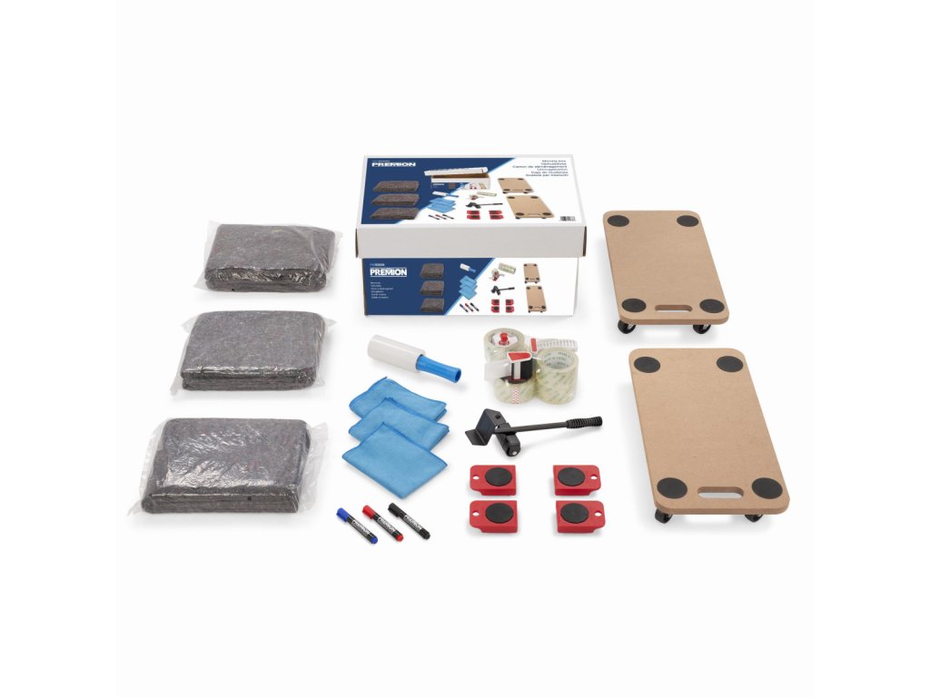 Stěhujete se? Tato praktická sada PREBOX006 od PREMION obsahuje všechny základní pomůcky, které vám usnadní balení a převoz. Díky stretch fólii snadno zabalíte nábytek i drobnosti, a s pomocí stěhovacích plošin bez námahy přesunete i těžké kusy. Vše je přehledně zabaleno v pevném a kompaktním kartonovém boxu.Obsah balení:• 1× sada pro stěhování nábytku (nosnost až 150 kg)• 2× stěhovací vozík (57,5 × 29 cm, nosnost až 150 kg) • 3× stěhovací deka (1 × 3 m) • 1× stretch fólie (14 × 750 cm) • 1× odvíječ s 6 rolkami lepicí pásky (50 mm × 50 m) • 3× popisovač (modrý, červený, černý) • 3× mikrovláknová utěrka (30 × 40 cm)