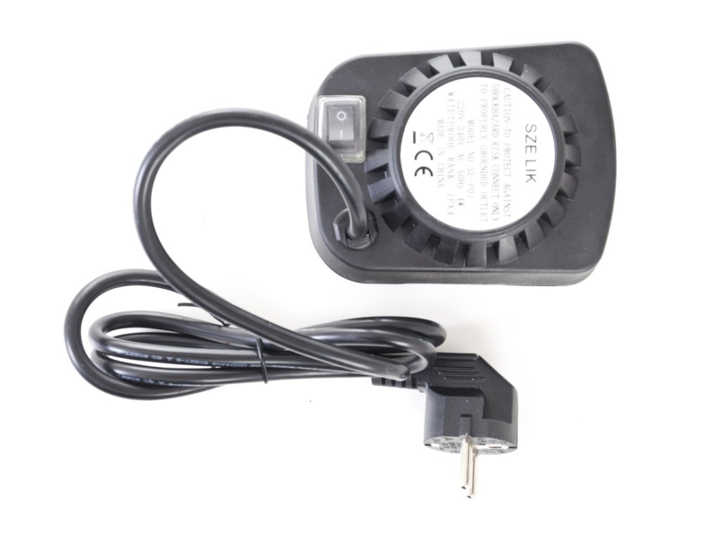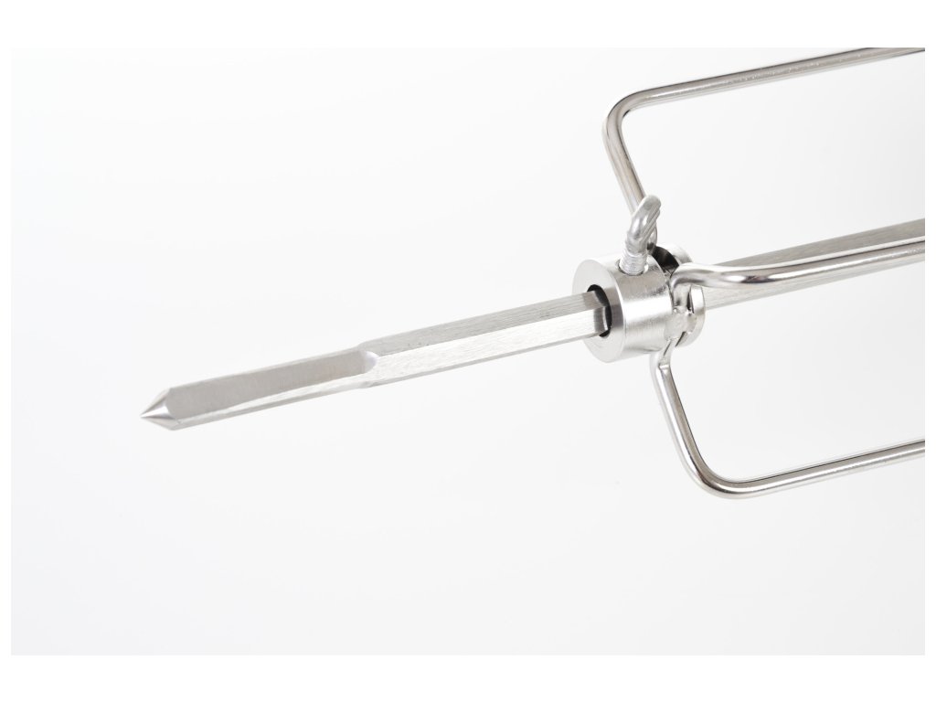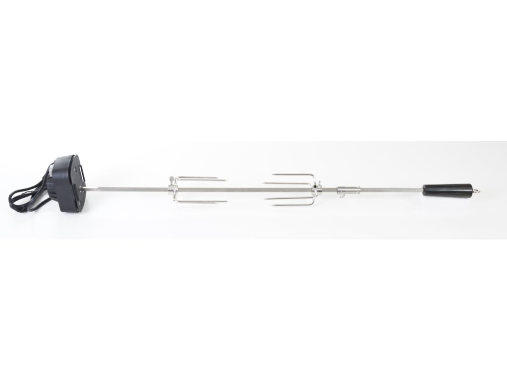Z jedné strany je jehla opatřena odnímatelným plastovým držadlem, na kterém je praktické očko pro uchycení. Z druhé strany se nachází motorek v plastovém krytu, na kterém je umístěno tlačítko na zapínání / vypínání. Motorek s napětím 230 V jednoduše zapojíte do elektřiny pomocí kabelu v délce cca 125 cm. Motorek s jehlou otáčí rychlostí asi 2 otáčky za minutu, aby se připravovaný pokrm nepřipékal, ale pekl se rovnoměrně.