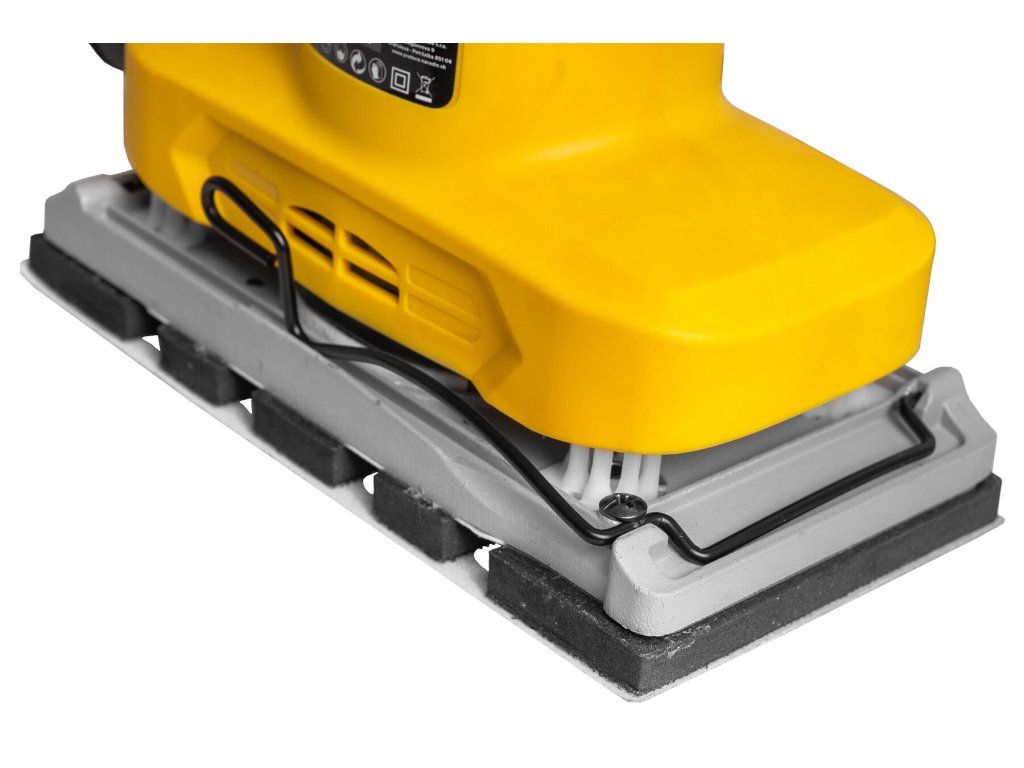 Výměna brusného papíru je snadná a jednoduchá, díky inovativnímu mechanismu. Stačí pouze odjistit dvě pérka na protilehlích stranách vibrační plochy a můžete snadno vyměnit brusný papír bez nadměrného usilí. Tento jednoduchý systém umožňuje rychlou úpravu a minimalizuje ztrátu času při práci.