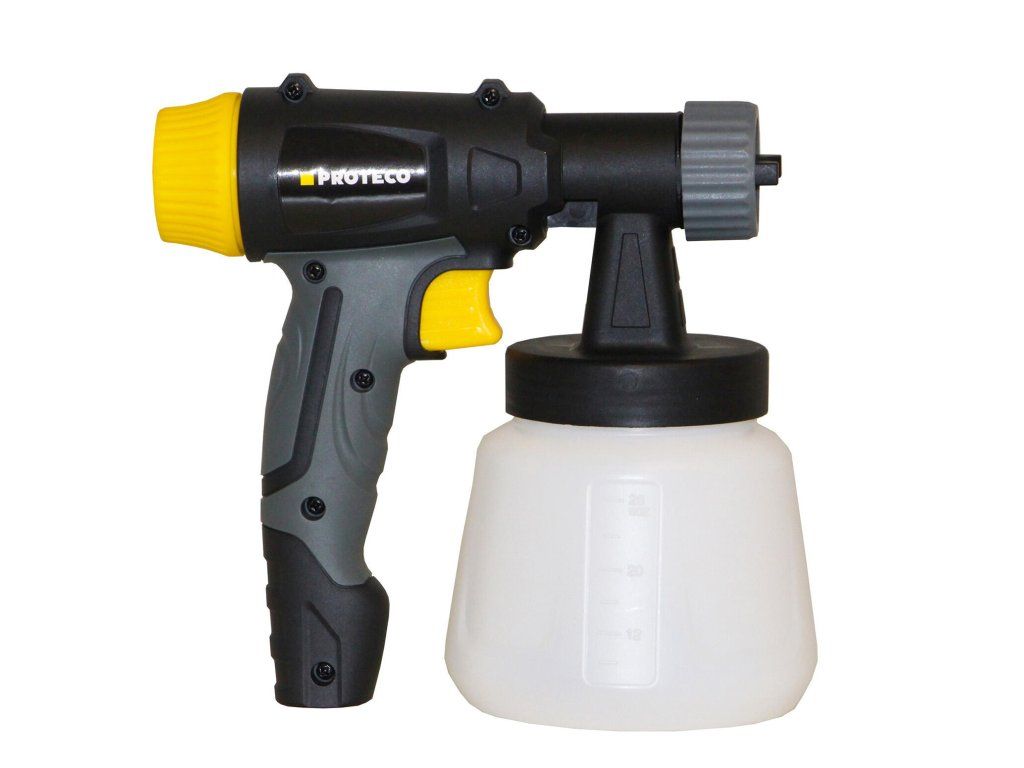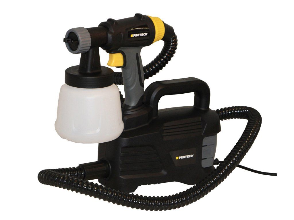 Pistole stříkací vzduchová s kompresorem 800 W Proteco je lehký mobilní stříkací systém vhodný pro použití v interiérech i exteriérech. Pistole je určena k stříkání různých druhů barev, laků - olejových, syntetických i na vodní bázy, lazur a latexových barev.