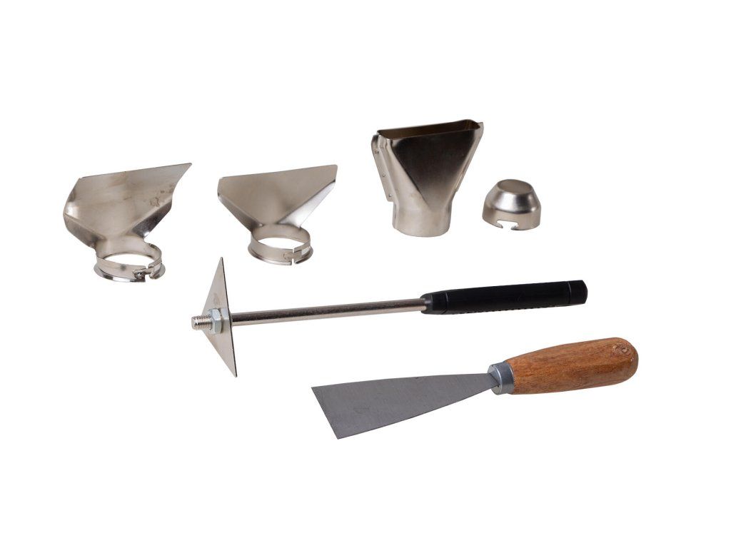 Součastí balení: Přepravní kufr, nástavec pro ochranu skla, nástavec pro svařování trubek, kuželový nástavec, nástavec pro sušení a rozmražování, škrabka na barvy a laky, špachtle