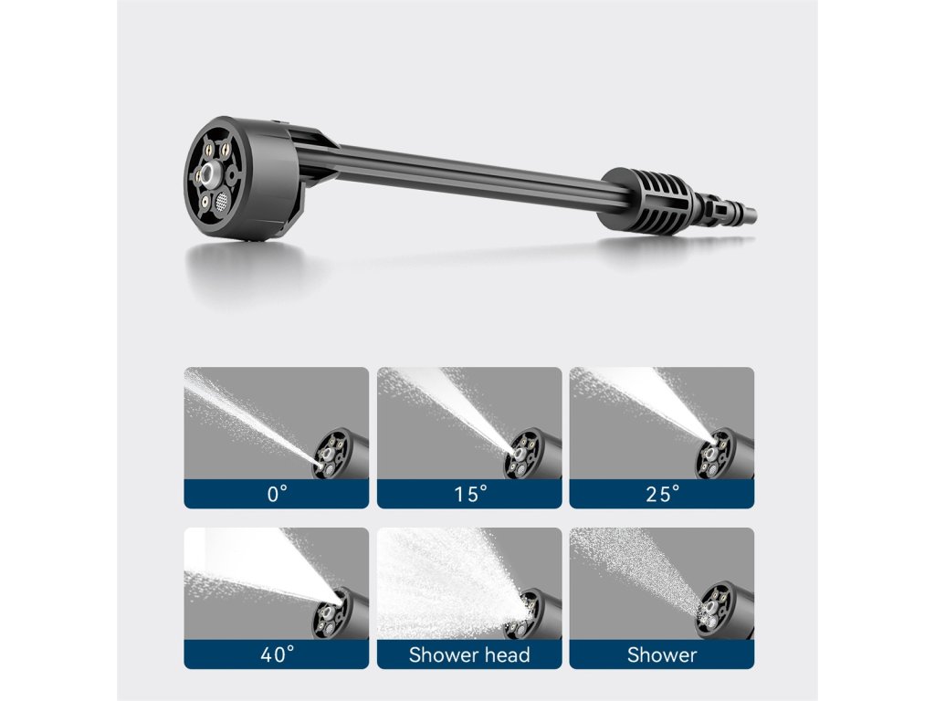 Je vybavena moderním bezuhlíkovým motorem PowerMax, který nabízí vysoký výkon, tichý chod a bezúdržbový provoz. Díky přehlednému displeji lze snadno nastavit tři úrovně tlaku ostřiku a zároveň sledovat aktuální stav nabití baterie. Součástí stroje je také multifunkční šestipolohová tryska – čtyři polohy poskytují vysokotlaký paprsek s úhlem 0°, 15°, 25° nebo 40°, další dvě polohy slouží k oplachu či zalévání s nízkým tlakem a širokým rozptylem.