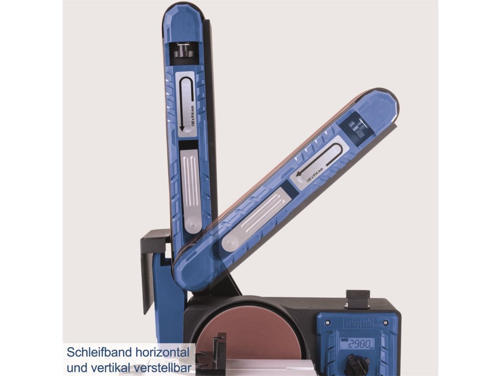 Rychlost je zřetelně čitelná na LCD displeji. Další výhodou celé brusky je její variabilita. Celá jednotka s brusným pásem se může naklopit o 90° z horizontální až do vertikální polohy. Přídavný stolek s úhlovým pravítkem se může sklopit a zajistit v rozmezí 0° až 45°. Na rozdíl od mnoha podobných brusek na trhu je kotoučová bruska integrována do těla stroje takovým způsobem, že nebrání práci ani s velkými obrobky.
