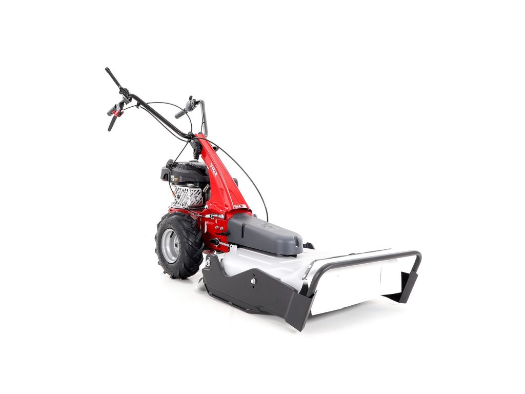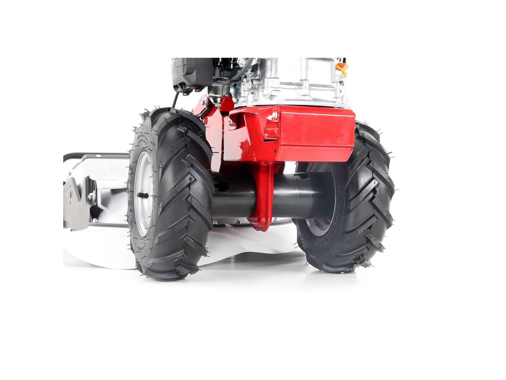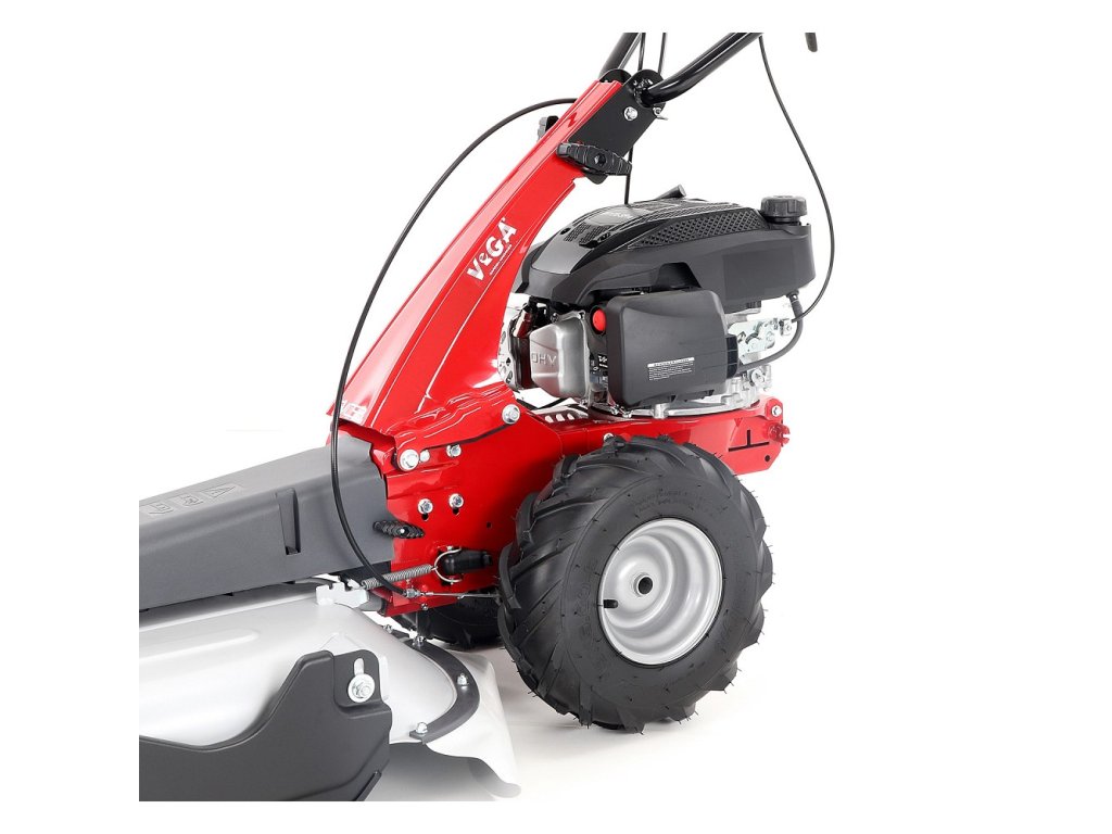 Díky tomu je manipulace se sekačkou pohodlná i v členitém nebo svažitém terénu. Jednostranný pojezdový systém poskytuje vysokou trakci a jistotu při práci ve vysokém porostu.