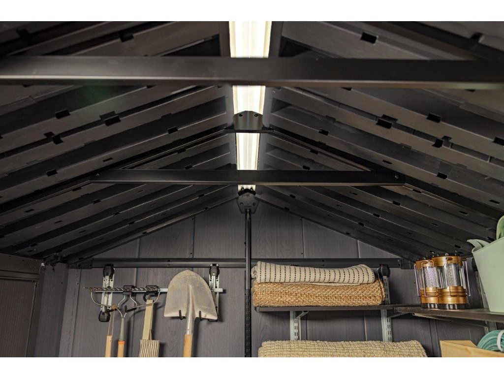 Vysoký strop usnadňuje pohyb uvnitř domku a větrací otvory umístěné vpředu, vzadu i po stranách zajišťují přirozené proudění vzduchu. Praktické jsou i stěny s možností vrtání, které umožňují připevnění polic, háčků či držáků na nářadí, což vám pomůže s organizací prostoru.