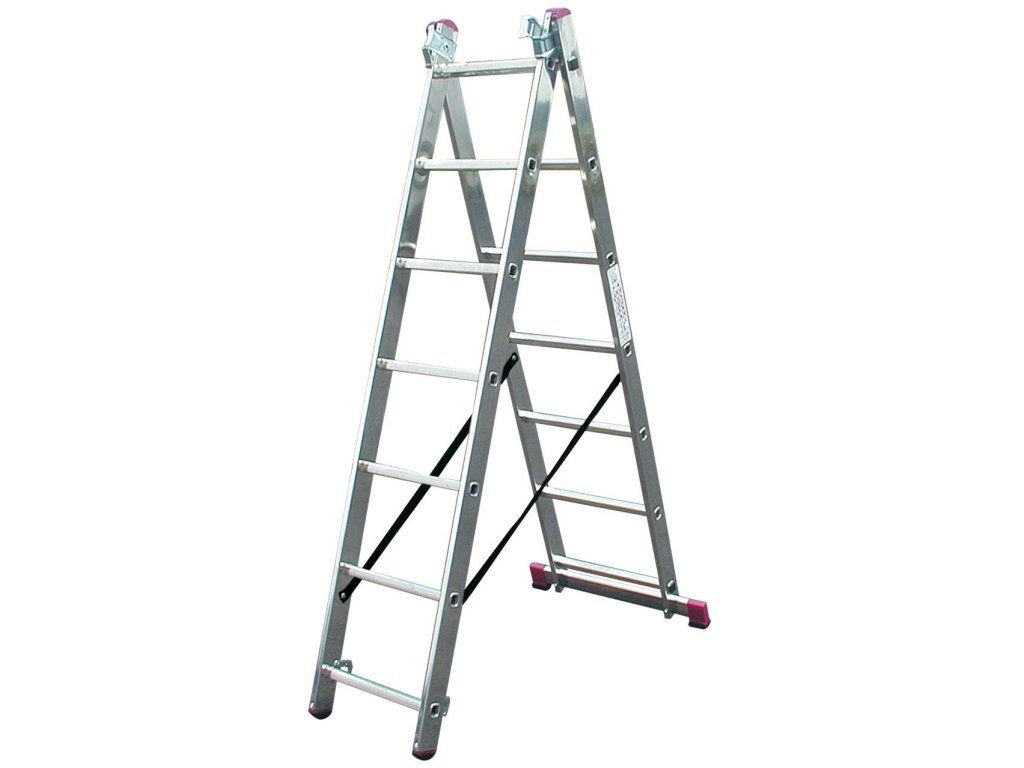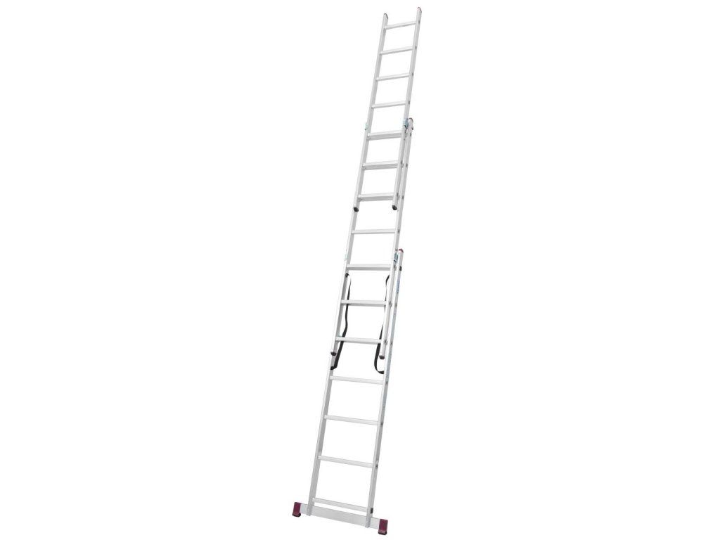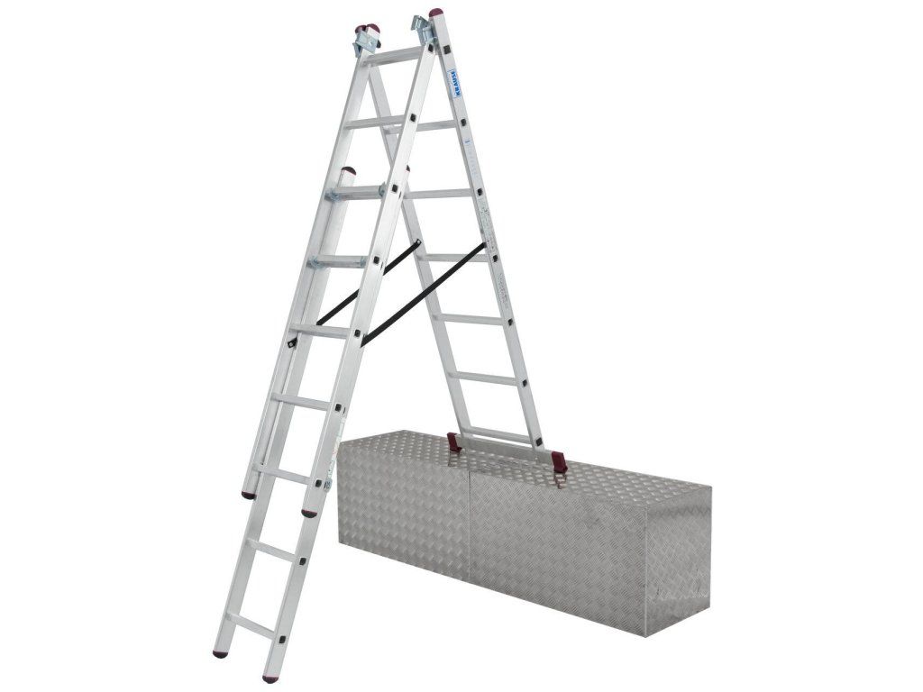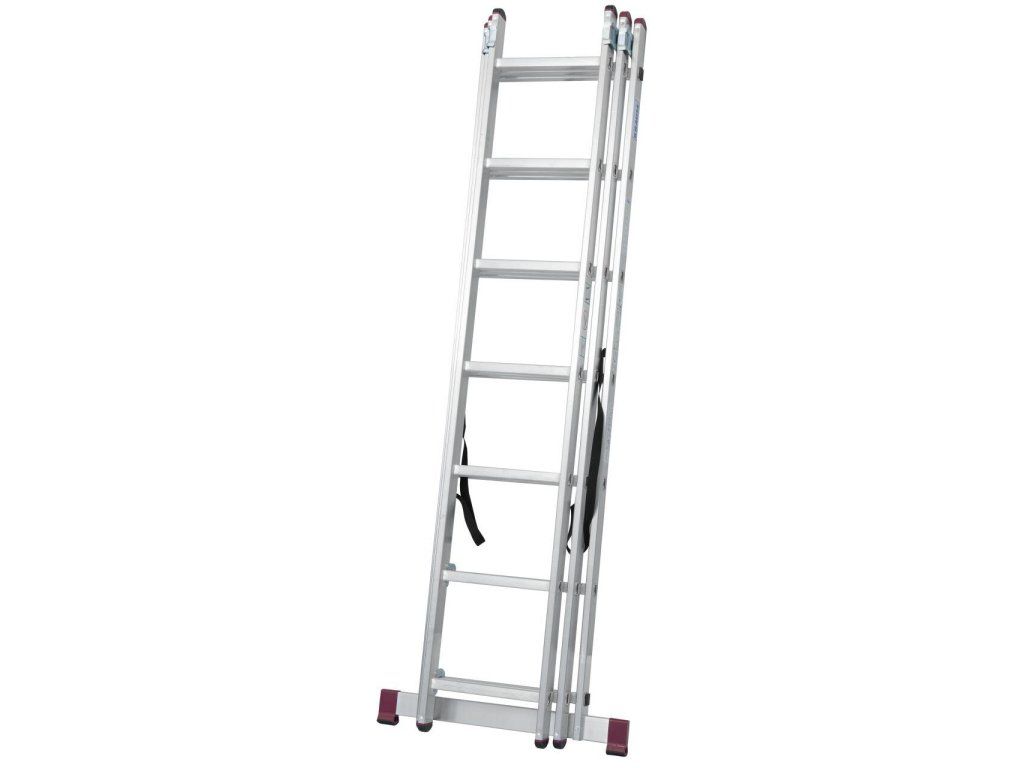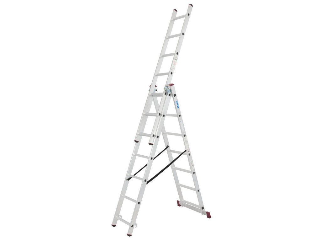 Trojdílný mnohoúčelový hliníkový žebřík, který lze díky unikátní konstrukci kromě běžného použití (opěrný žebřík, štafle a výsuvný žebřík) využít i na schodištích či jiných víceúrovňových površích.