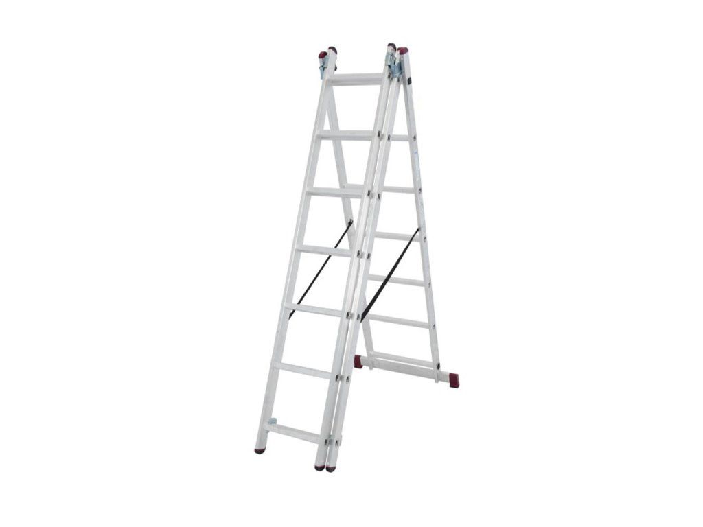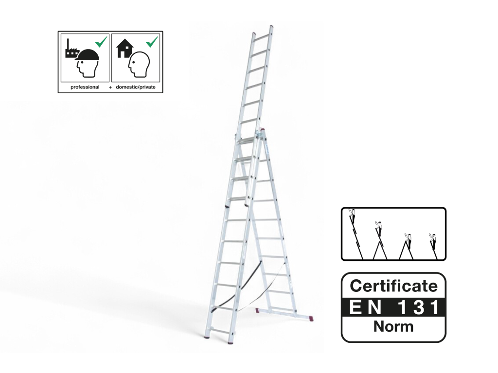 Trojdílný mnohoúčelový hliníkový žebřík je možné použití jako opěrný žebřík, štafle nebo výsuvný žebřík.